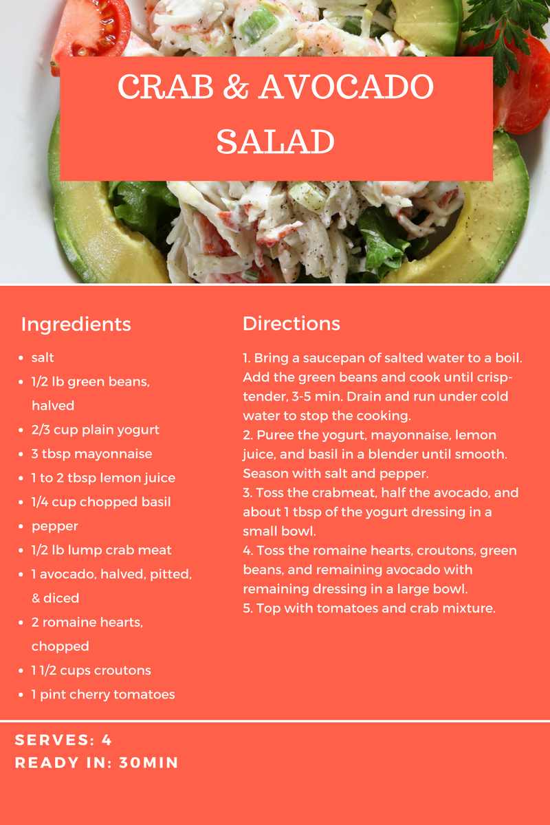 Crab & Avocado Salad recipe adapted from Food Network Featured Poblano & Portabella Fajitas Blood Orange Carrot & Ginger Kombucha Vinaigrette Dressing Autumn Harvest Salad w/ Pomegranate Brussel Sprout Salad w/ Whole Grain Mustard Dressing Lunch, Salads, Side Dishes, Snacksjim hovingMarch 30, 2018crab, salad, avocado, seafood Facebook0 Twitter LinkedIn0 Reddit Tumblr Pinterest0 0 Likes